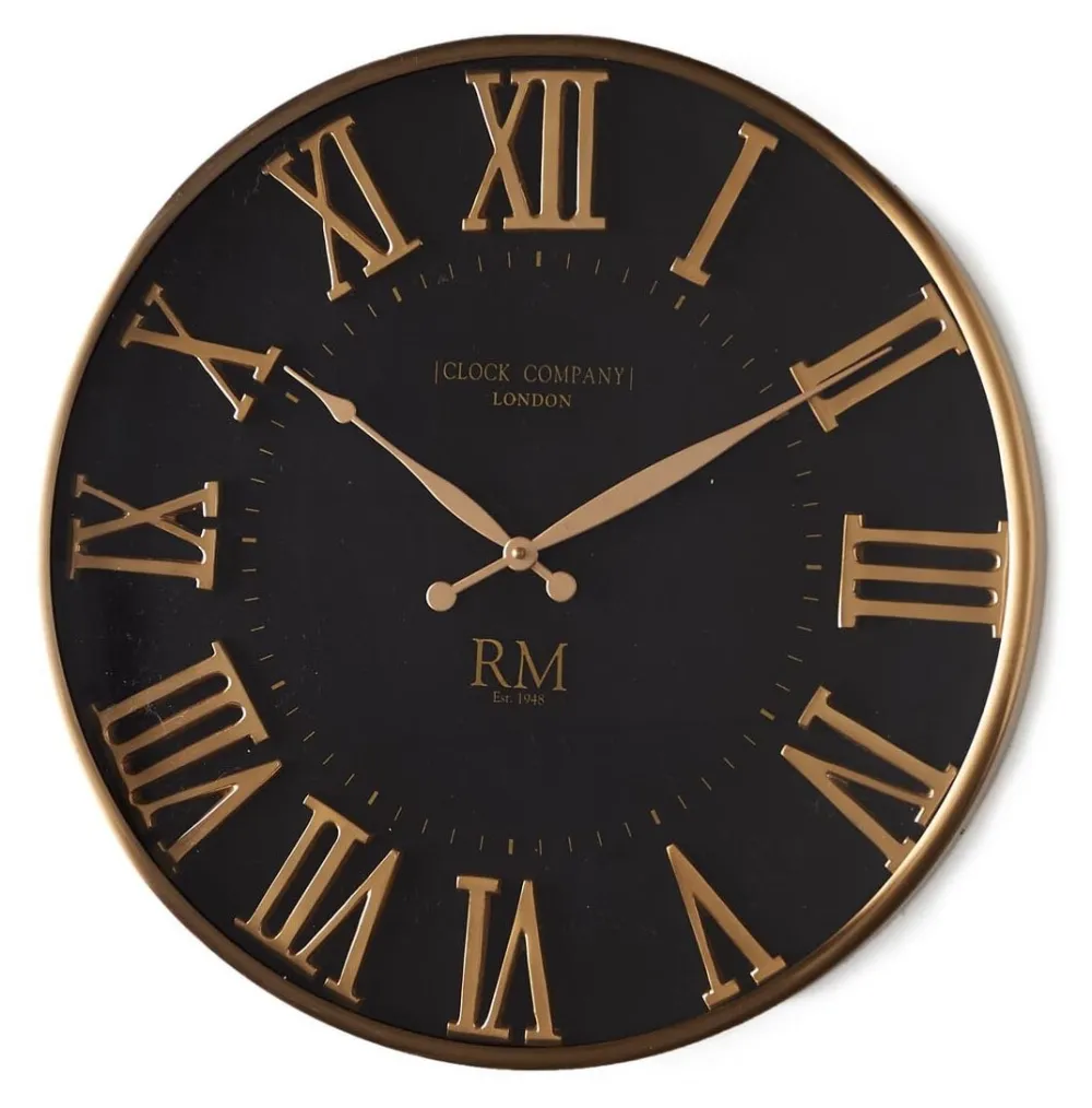 Stijlvolle klok met Romeinse cijfers en sierlijke wijzers die uw interieur een chique touch geeft. . Hij heeft een zwarte achtergrond met brass-kleurige details. In de zwarte achtergrond staat ‘clock company London’ en RM Est. 1948′ geschreven. De klok is 5 centimeter dik, waardoor hij robuust oogt. Hij heeft een doorsnede van 51 centimeter.