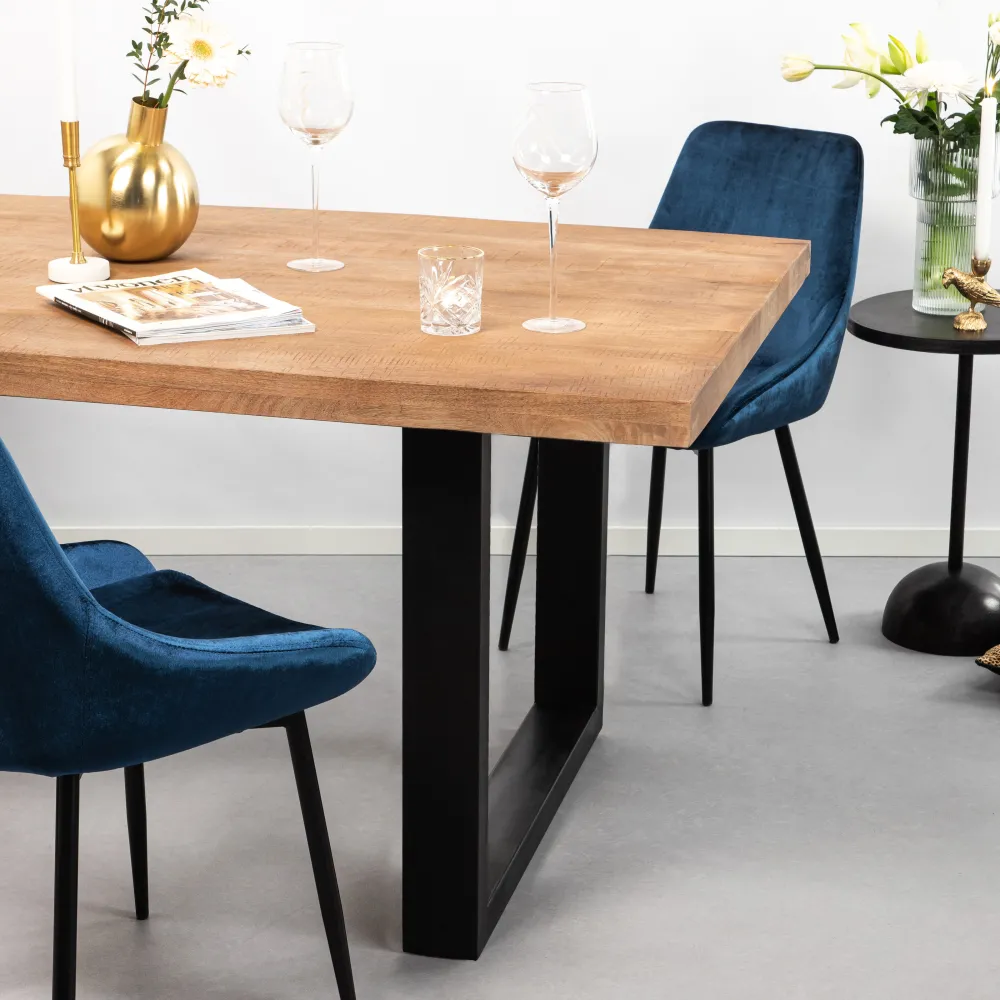 De zwart stalen poten in U-vorm maken het uiterlijk van deze tafel helemaal af. Kies het formaat dat in uw woonruimte past, plaats er mooie stoelen omheen en genieten maar. Kies voor eetkamerstoelen bekleed met velvet stof of ga voor lederen exemplaren. Alles is te combineren met eettafel ‘Yannick U’.