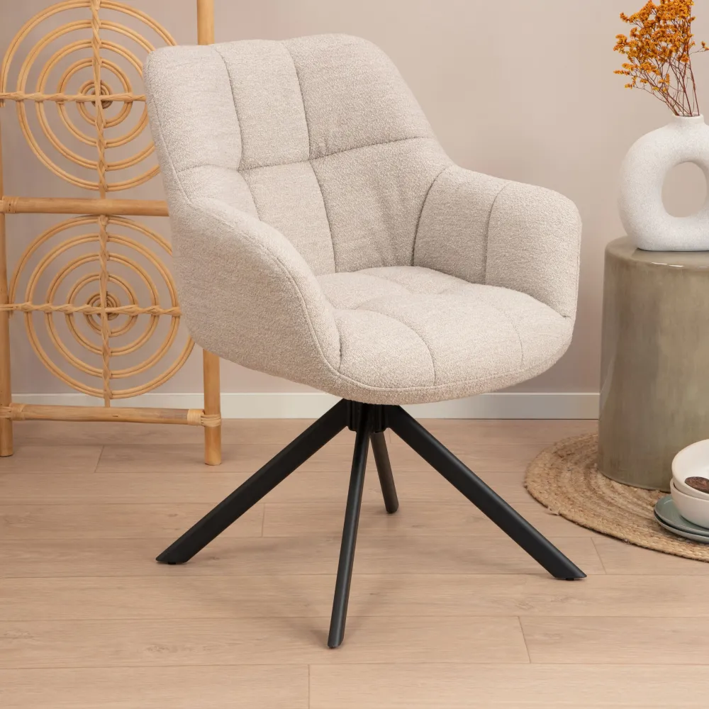 De metalen kruispoot waar de zitting op leunt geeft een speelse look aan deze eetkamerstoel. Extra fijn: de stoel is draaibaar. Hierdoor kun je makkelijk opstaan, zonder te hoeven schuiven.