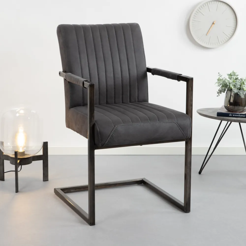 De stoel heeft een mooie lederlook zitting en de verticale stiksels geven het geheel een bijzondere en speelse look. Het kunstleder op de stoel is makkelijk schoon te houden. Haal er een vochtig doekje overheen en je stoel is weer als nieuw. Het metalen onderstel is gemaakt van vintage afgewerkt staal en de armleggers zijn bekleed met het hoogwaardige kunstleder. Zo zit je urenlang comfortabel op deze stoel.