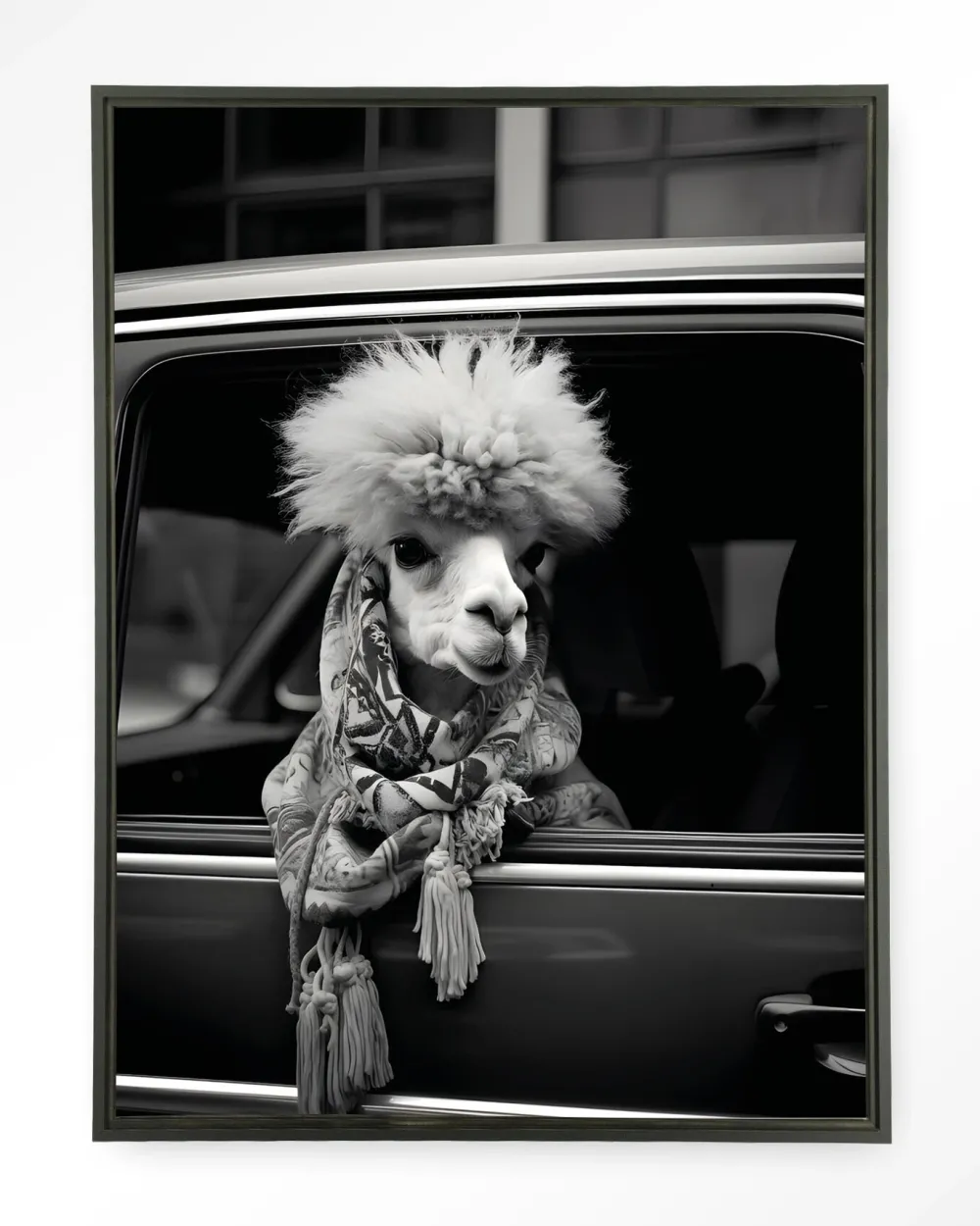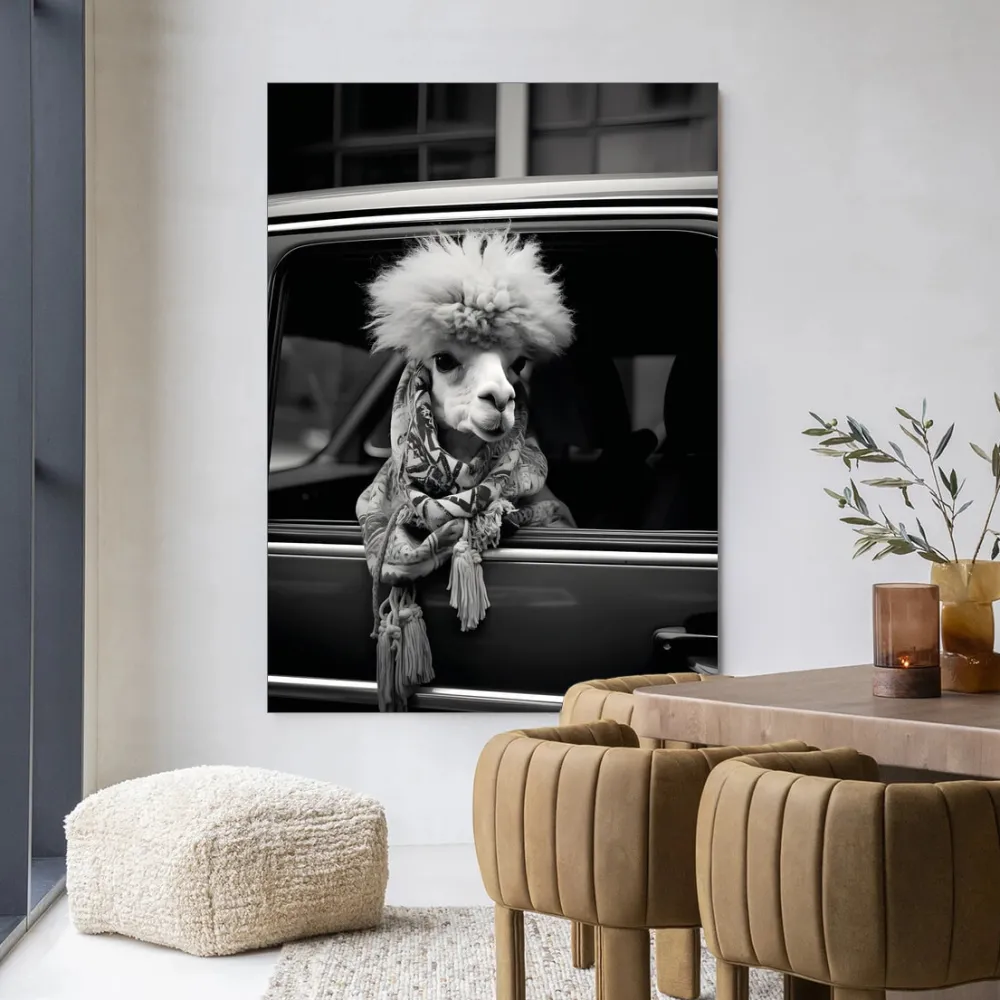 Urban Cotton Wandkleden|Wandkleed Alpaca In Taxi in maat en frame naar keuze