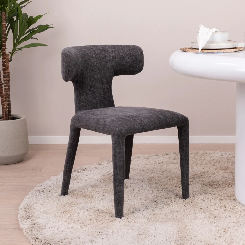 De stoel is opgebouwd uit een stalen frame met een multiplex zitting, in zijn volledigheid bedekt met een PU foam laag en van top tot teen bekleed met onze Tintle geweven stof. Onze Tintle geweven stof heeft een zachte grip en voelt comfortabel aan. De compact geweven stof is gemaakt van 100% polyester en heeft een Martindale van 100.000. De stof is opvallend door de lichte kleurmelange in de garens, wat zorgt voor een sprekende diepte in het meubelstuk.