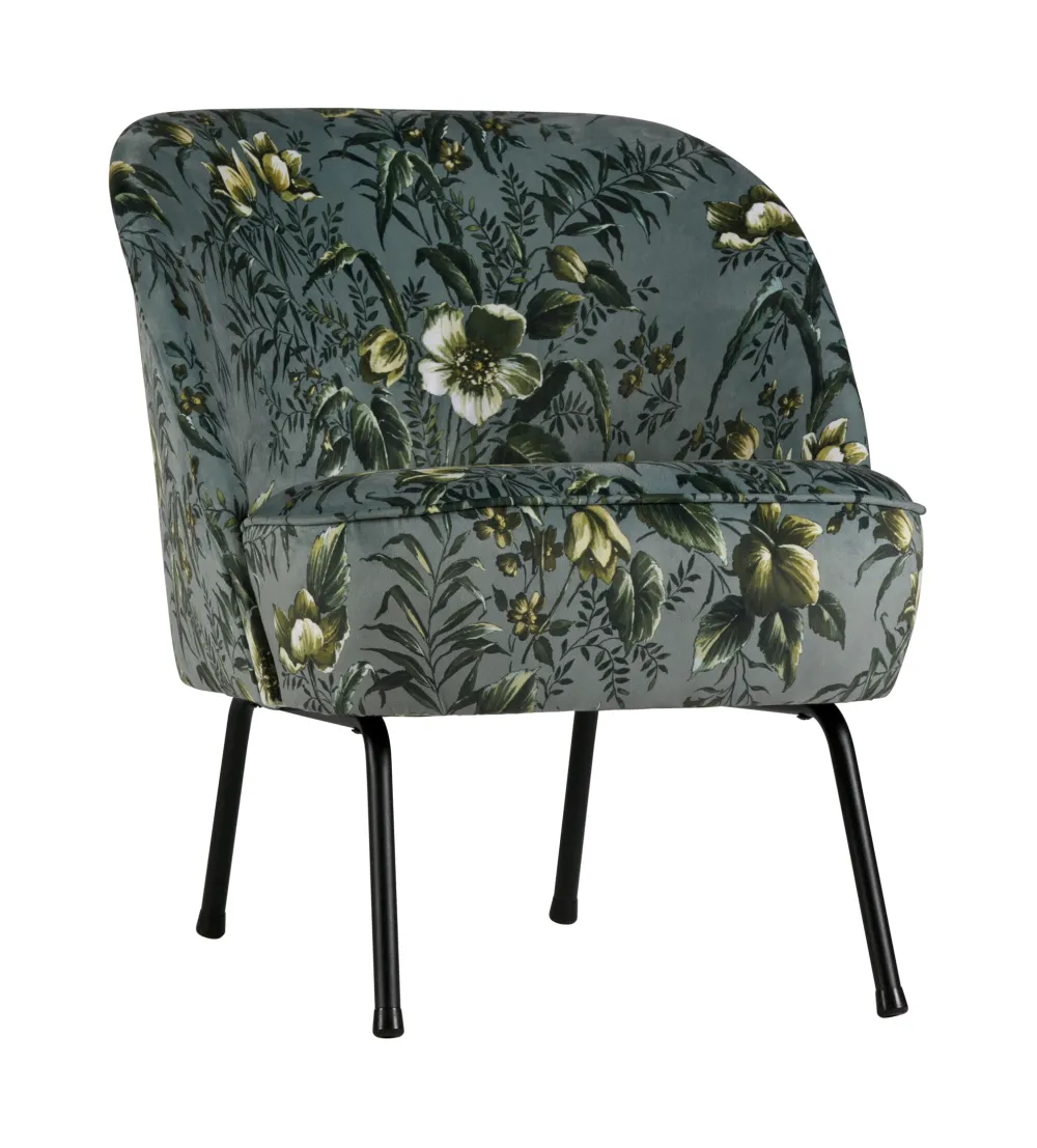 De Vogue fauteuil is gestoffeerd met een prachtige en rijke velvet stof met bloemenprint (100% polyester). De velvet bekleding is beschikbaar in de kleuren grijs en mosterd. De poten zijn gemaakt van metaal dat is afgewerkt in een zwarte kleur. De Vogue fauteuil heeft een hoogte van 69 cm, een breedte van 57 cm en een diepte van 70 cm. De voorpoten hebben een hoogte van 25 cm en de achterpoten hebben een hoogte van 22,5 cm. De zithoogte is 44 cm, de zitdiepte is 54 cm en de zitbreedte is 54cm.