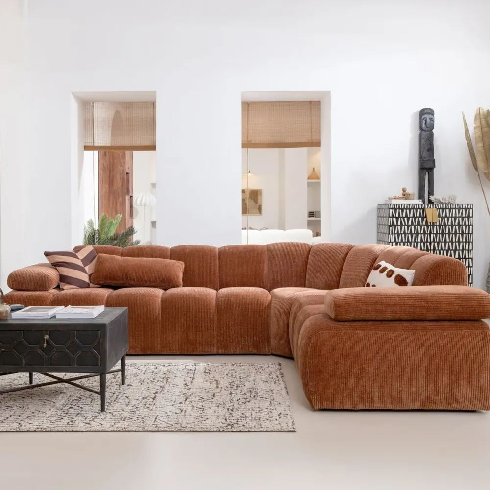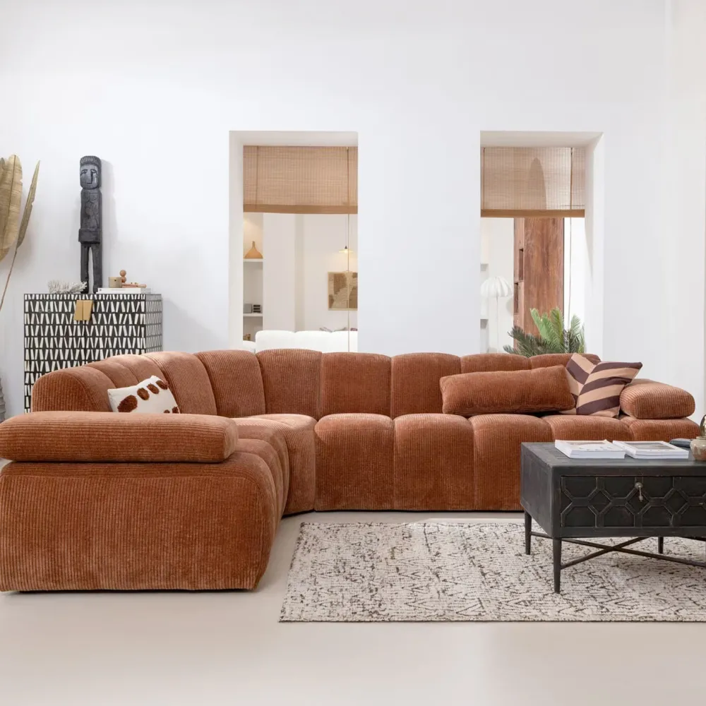 De Mojo hoekbank van WOOOD combineert comfort met een speelse uitstraling. De bank is bekleed met geweven Remy ribstof in een warme roestbruine kleur, wat zorgt voor een zachte, uitnodigende sfeer in de woonkamer. De verticale stiksels geven de bank extra karakter en structuur.