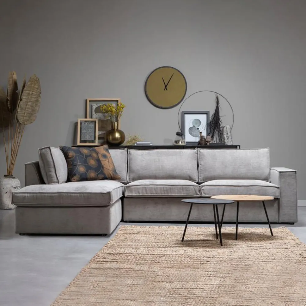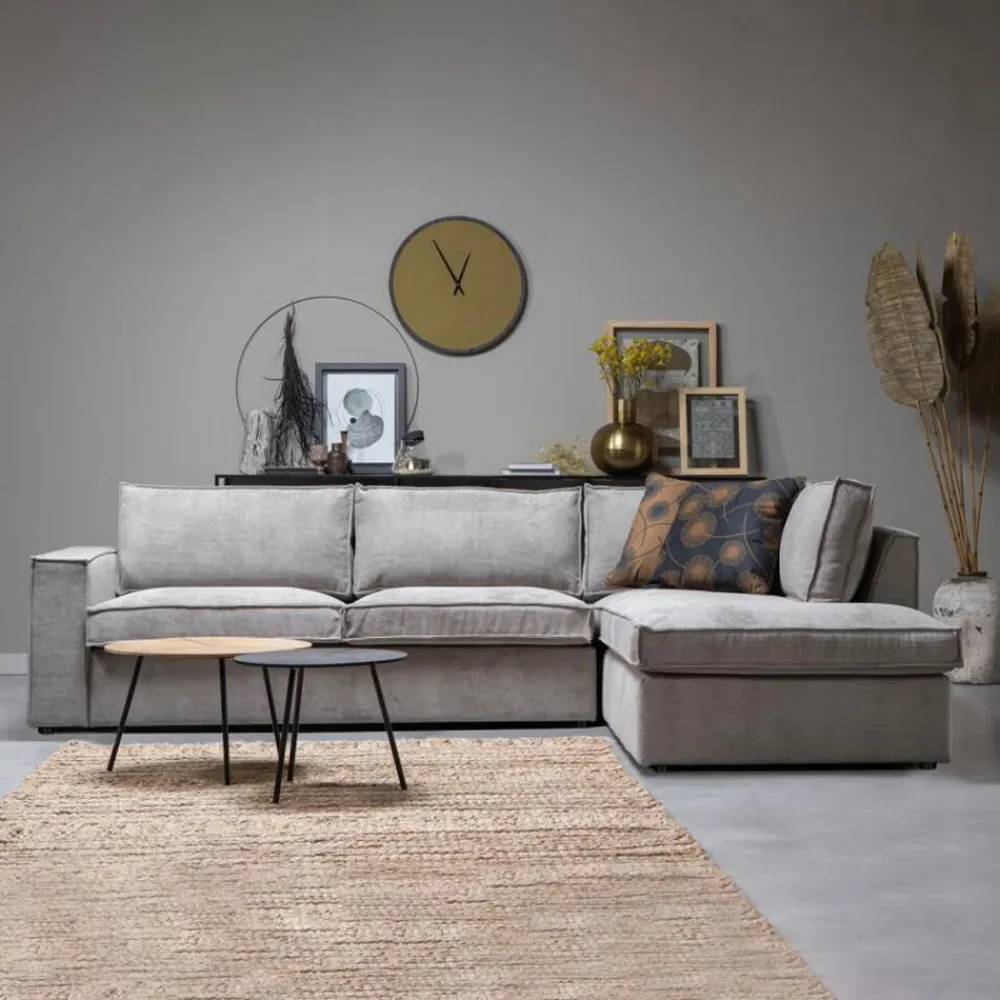 De Thomas hoekbank heeft een basic en warme uitstraling. Deze bank (met de hoek aan de rechterkant) is voorzien van een stevige polyester ribstof (Martindale 45.000) in de kleur vergrijsd groen en past goed in het interieur van nu.