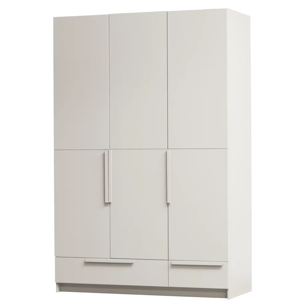 De Pure kledingkast van WOOOD is een royale kast met veel opbergruimte en een stijlvolle uitstraling. Gemaakt van stevig grenenhout en uitgevoerd in de moderne dust kleur, past deze brede kast perfect in een modern interieur. De indeling is praktisch en overzichtelijk: achter de twee brede deuren vind je een legplank en een royale roede voor hangende kleding, terwijl de derde deur vier planken verbergt voor gevouwen items en accessoires.
