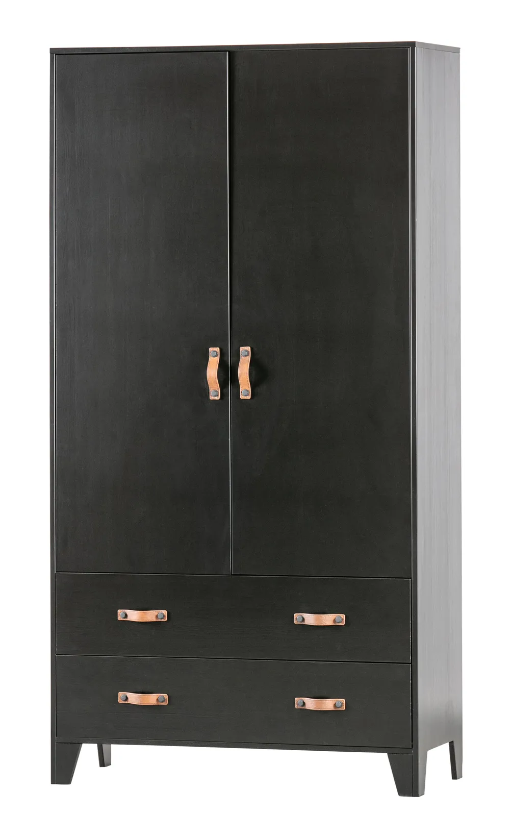 De Dian kledingkast van WOOOD is een robuuste en stoere kast van zwart grenenhout, afgewerkt met bruine leren greepjes die een warm contrast vormen. De kast heeft een basic ontwerp met twee deuren en twee lades. Achter de deuren vind je drie planken en een roede, ideaal voor zowel hangende kleding als gevouwen items.