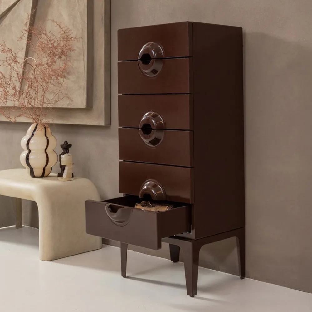 Met een hoogte van 120 cm en subtiele proporties biedt de ladekast balans tussen visuele aanwezigheid en ruimtelijkheid. Deze kast geeft een warme en tijdloze uitstraling, terwijl het subtiel moderniteit toevoegt.