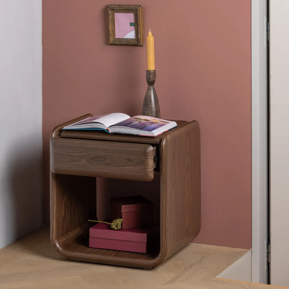 De Elura ladekast brengt een vriendelijke uitstraling in jouw slaapkamer. Door de afgeronde hoeken en het luchtige design creëer je een rustgevende plek waar je je prettig voelt. Het Nederlandse interieurmerk WOOOD combineert een toegankelijk ontwerp met de warme uitstraling van fineer. De bruine kleur geeft een natuurlijk karakter aan je interieur. Of je deze kast nu als nachtkastje naast je bed plaatst of gebruikt voor extra opbergruimte in de woonkamer, het compacte formaat maakt hem geschikt voor verschillende plekken in huis. De zichtbare nerftekening voegt een authentiek detail toe waar je dagelijks van geniet.