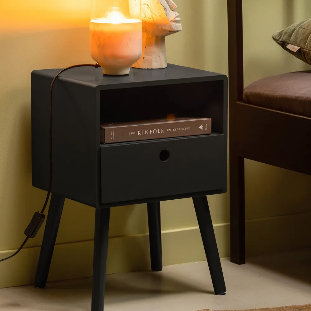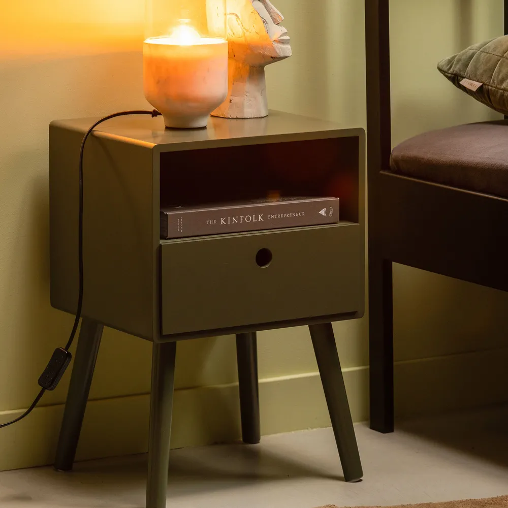 De lade eronder biedt extra opbergruimte en heeft een speels detail: een cirkelvormige opening die dient als handgreep. Dit maakt de lade makkelijk te openen en geeft het geheel een trendy uitstraling. Nachtkastje Ozzy combineert eenvoud, design en gemak in een compact formaat.