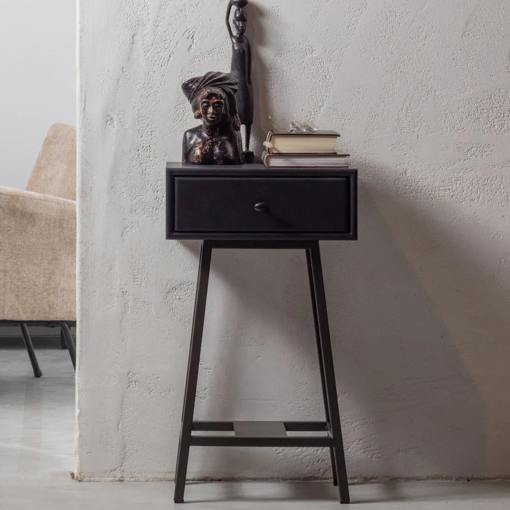- Het houten tafeltje met lade heeft een vintage uitstraling en een hoog must-have gehalte.