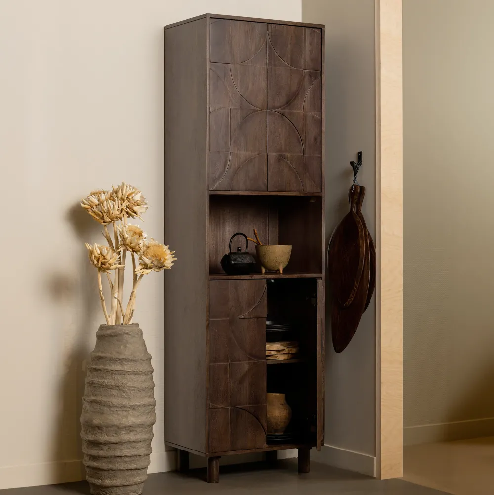 Opbergkast Draw van WOOOD is een karaktervol meubel met een warme, walnootkleurige finish op mangohout. De kast combineert strakke lijnen met zachte details en past perfect binnen de Japandi stijl. De deuren boven en onder worden onderbroken door een open vak in het midden, wat zorgt voor een luchtig ritme in het ontwerp.