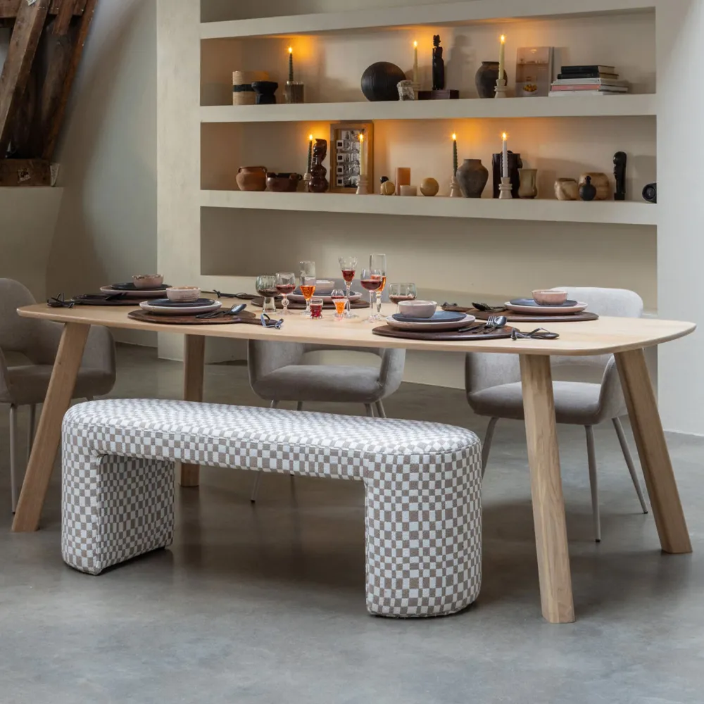 Het tafelblad en de tafelpoten zijn gemaakt van stroken verlijmd eikenhout met een doorgaande lamelverbinding wat een mooi rustig motief creëert. Eikenhout wordt gekenmerkt door de duidelijk zichtbare nerftekening. De natuurlijke imperfecties van het eikenhout maken elke tafel uniek. De tafelbladen en tafelpoten zijn licht geschuurd waardoor de nerftekeningen worden geaccentueerd en de beits- en lak kleuren nog mooier tot uiting komen. Het eikenhout in onze collecties is FSC mix gecertificeerd.