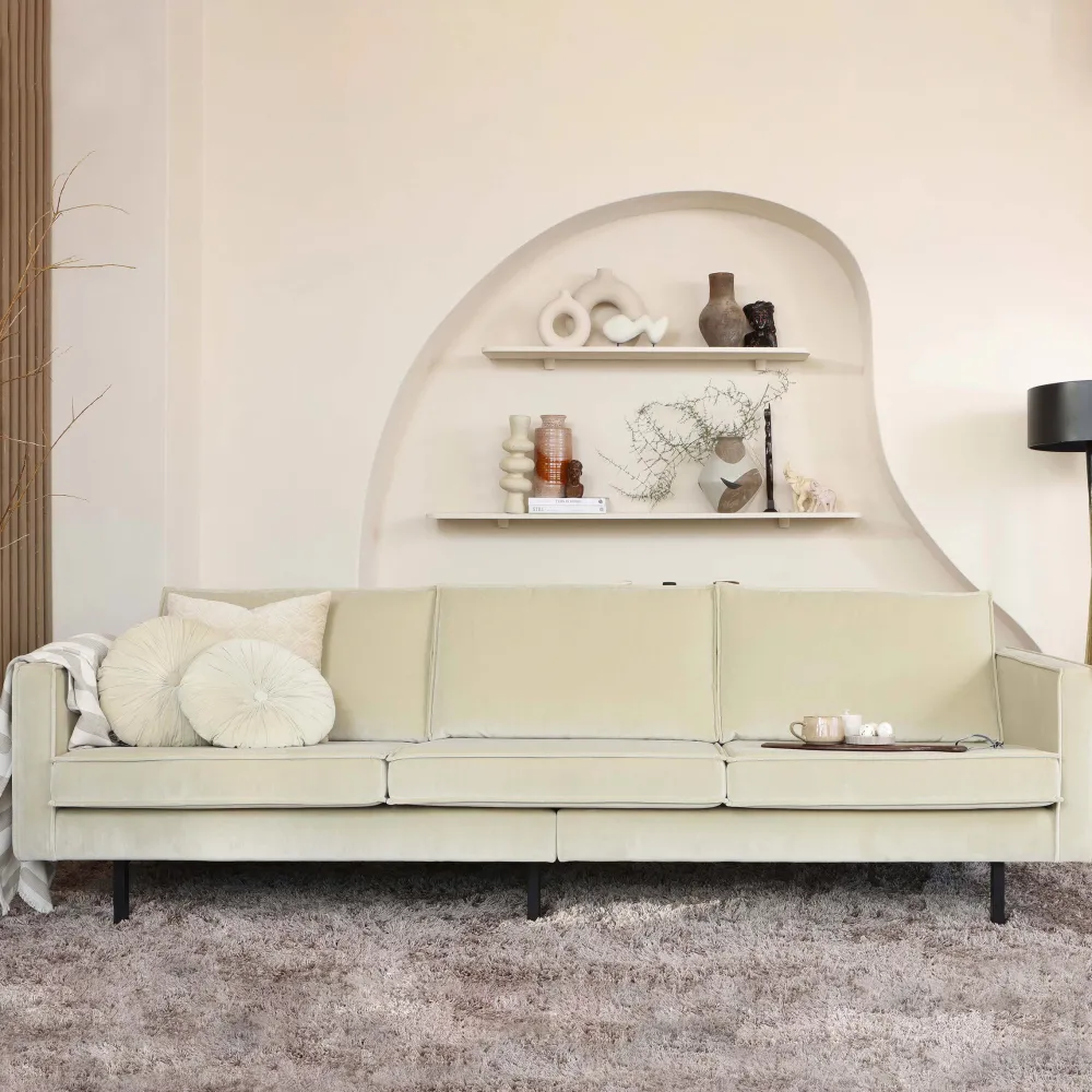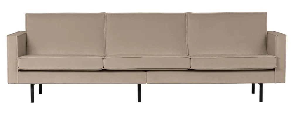 De Rodeo bank is opgebouwd uit een combinatie van massief hout, spaanplaat, polyurethaan schuim met een dichtheid van 25 kg/m3 en een zigzag vering. De zitting bevat een polyurethaan schuim met een dichtheid van 30 kg/m3 (T3037). De rugleuning bestaat uit een combinatie van 70% gesneden schuim en 30% siliconen. Deze Rodeo is bekleed met een rijke velvet. Onze Jarra fluwelen stof heeft een luxe uitstraling. De stof voelt fijn aan en heeft een mooie lichte glans. De Jarra velvet bestaat uit 100% polyester en heeft een volle en zware kwaliteit. Het materiaal is daarom geschikt voor intensief gebruik (Martindale 100.000). Naast het stijlvolle design blijft de velvet stof lang mooi. Onze Jarra stof zal niet snel pillen en is kleurvast. De stof is, tot verrassing van velen, een zeer gemakkelijke stof om te onderhouden.