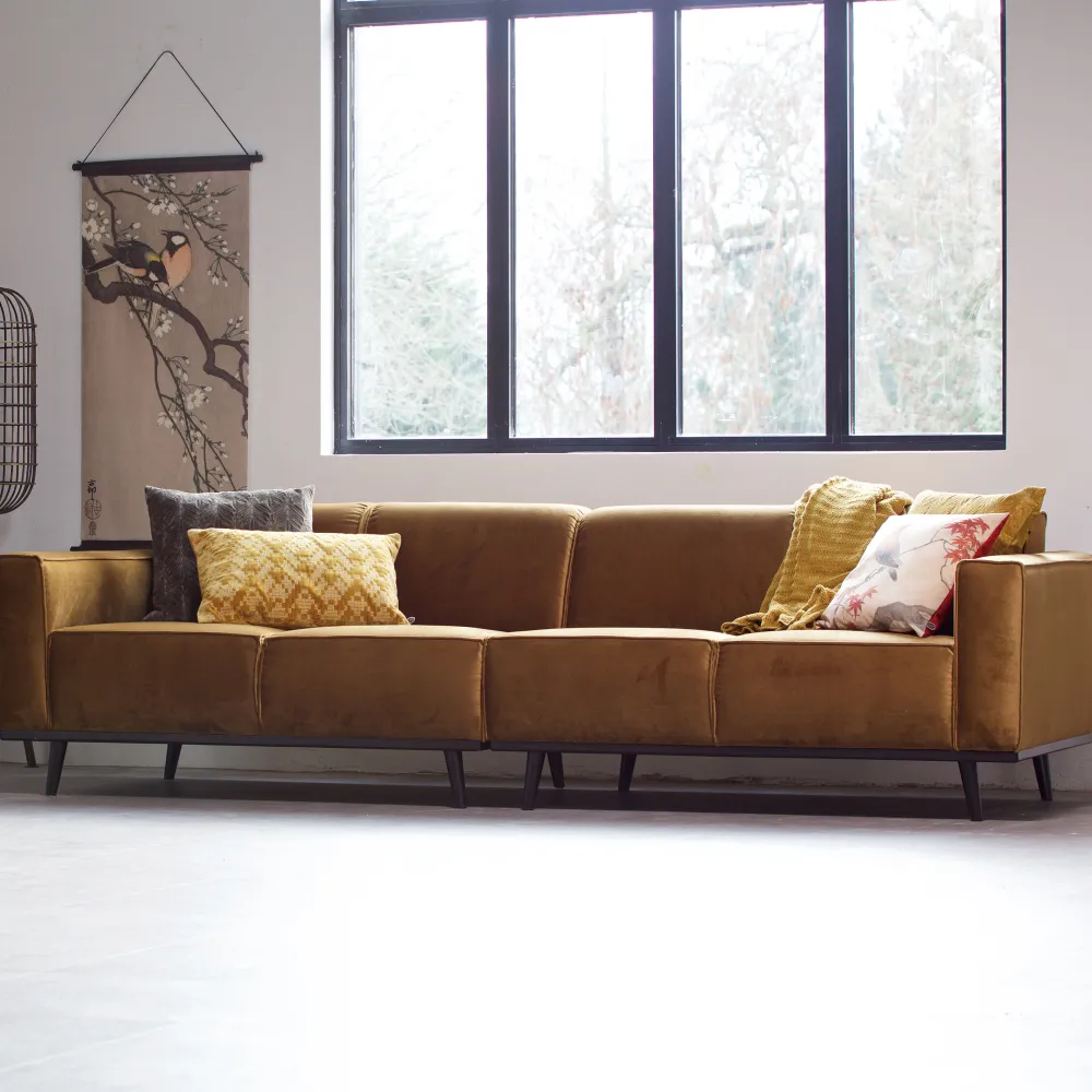 De naam van deze bank zegt genoeg, toch? Een bank als deze staat als een duidelijk element in huis. Een bank bepaalt de sfeer van het interieur en deze bank biedt een goede basis voor meerdere woonstijlen. Het design van Statement is basic, maar valt door de omvang natuurlijk wel op. Deze ruime 4-zits bank biedt ruimte genoeg voor het hele gezin en zit heerlijk. Deze bank Statement past perfect in de collectie van WOOOD, is puur en stoer en bestaat uit meerdere varianten, stoffen en kleuren. Deze variant is voorzien van honing geel velvet.