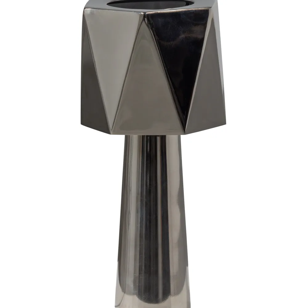 Deze unieke tafellamp komt uit de collectie van het Nederlandse interieurmerk WOOOD. Compact van formaat, groots in uitstraling , deze eyecatcher trekt gegarandeerd de aandacht. Het speelse geometrische design in glanzend chroomkleurig metaal geeft de lamp een moderne en luxe look. Of het licht nu aan of uit is: deze lamp voegt altijd karakter toe aan je interieur.