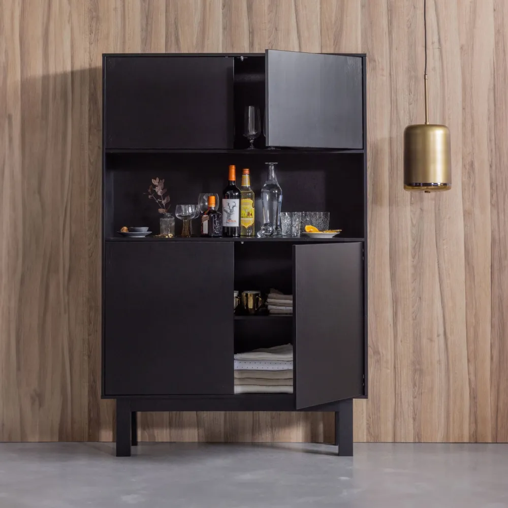 Buffetkast Finca van WOOOD is een strak vormgegeven meubel met een minimalistische uitstraling. Uitgevoerd in mat diepzwart en gemaakt van massief grenenhout, straalt de kast kracht en elegantie uit. Het push-to-open systeem zorgt voor een naadloze afwerking zonder zichtbare handgrepen. Centraal in het ontwerp bevindt zich een open vak, ideaal voor het laten zien van je favoriete accessoires, boeken of servies