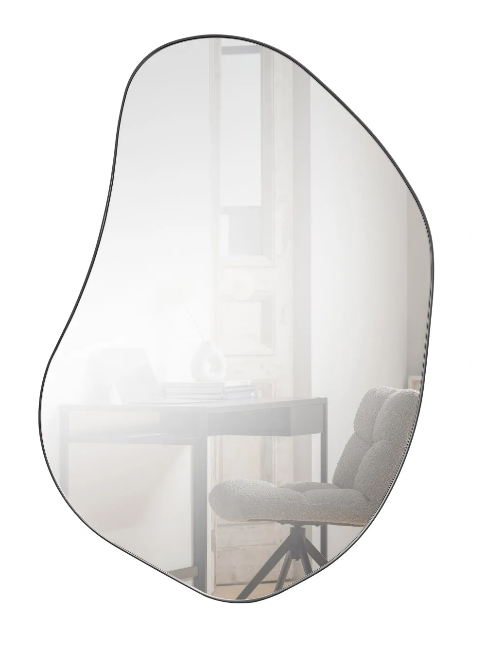 Spiegel ‘Romee’ van WOOOD is een organisch gevormde spiegel met een minimalistische uitstraling. De smalle metalen rand met een matzwarte poedercoating omlijst het spiegelglas subtiel en stijlvol, en voegt een opvallend accent toe aan elk interieur. De vloeiende vorm zorgt voor een zachte, natuurlijke touch aan de wand.