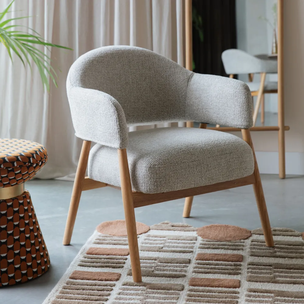 | Materiaal: | Bouclé bekleding (100% polyester) en eikenhouten frame |