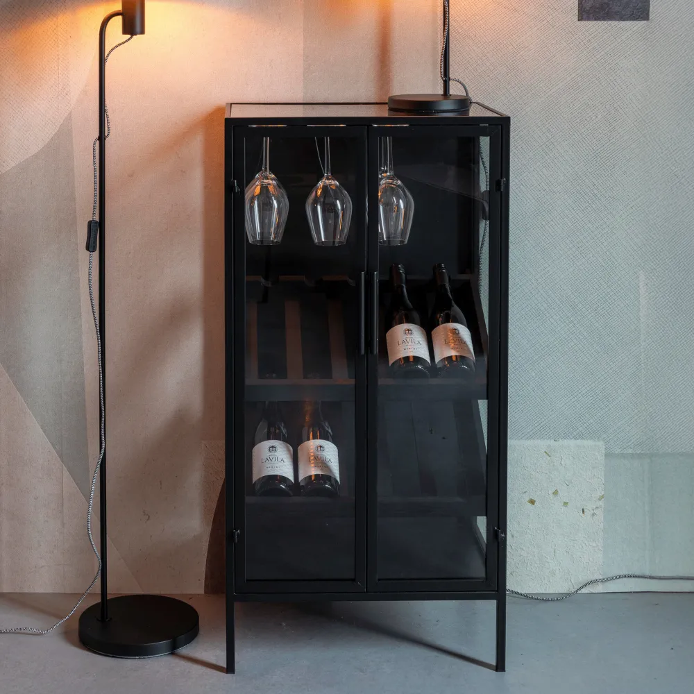 De wijnkast Erickson van ZILT is een stijlvolle kast die modern design en praktisch gebruik prachtig samenbrengt. Het gepoedercoate ijzeren frame geeft de kast een stoere uitstraling, terwijl de glazen deuren zorgen voor een elegante en open look.