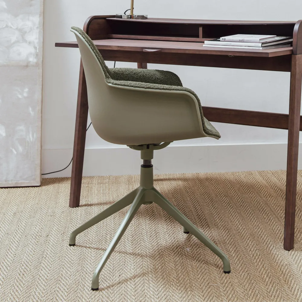 - Deze stoel komt met of zonder armleuningen en, ook al zo fijn, met draaivoet.