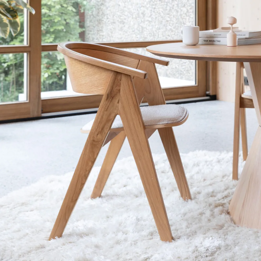 - De bijpassende gestoffeerde bouclé zitting biedt de NDSM-stoel volledig comfort.