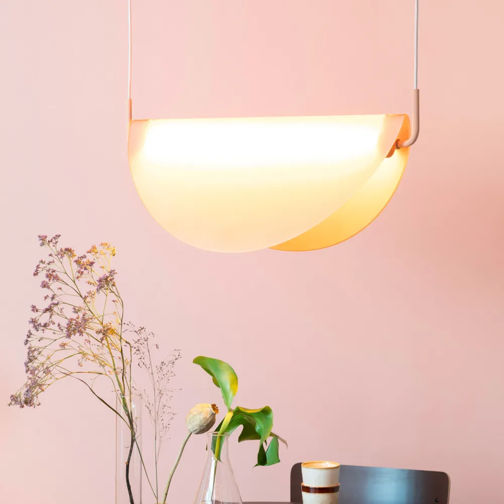 Krijg jij ook die fijne jaren 80 vibe van hanglamp Rani mee? We zijn er dol op! Rani is er in twee versies die op elkaar lijken maar toch heel verschillend zijn. De roze versie verstopt de moderne lichtbron als die niet aan staat, terwijl de variant met getint glas de lichtbron juist een hoofdrol geeft.