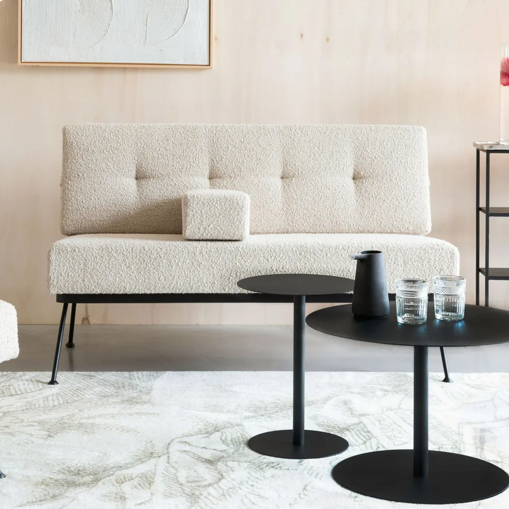 Voor Sofa Bowie lieten we ons inspireren door de kubistische ontwerpen die begin jaren zestig revolutionair waren in elegante meubels. We hebben onze eigen draai aan die vormentaal gegeven door strak met zacht te combineren. Onze kubistische Bowie heeft een zwart metalen frame en een rugleuning met draadmetaal, maar een zachte, bouclé-bekleding en een getufte rugleuning. Juist die laatste twee geven Bowie een zachte touch, precies zoals we het graag hebben.