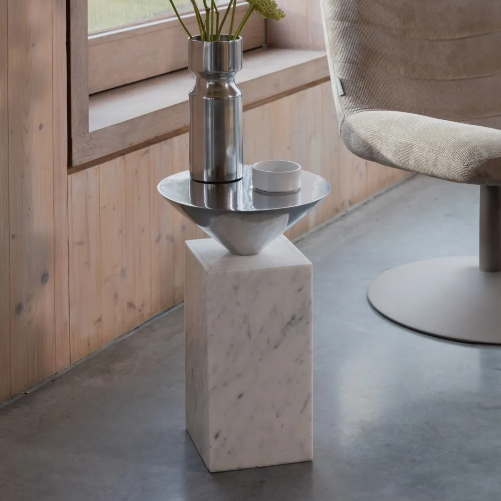 Ontdek de allure van de Pride bijzettafel, met een vierkante basis van 100% natuurlijk marmer en een aluminium kegelvormig blad, combineert dit stuk feilloos futurisme met klasse. Het dynamische samenspel van vierkante en kegelvormige vormen creëert een eye-catching look.