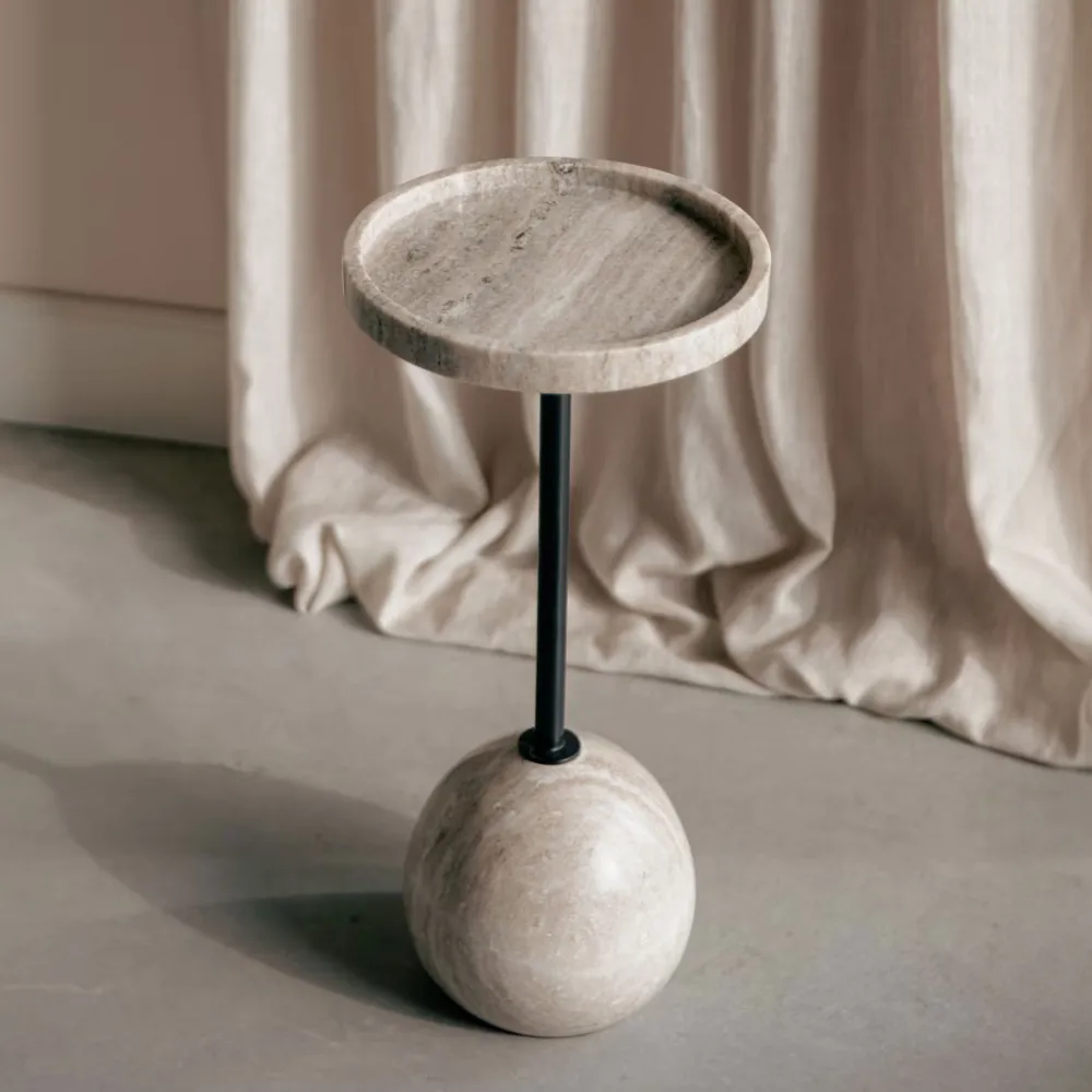 Het bruine marmeren blad straalt klasse en luxe uit, terwijl de ronde voet in de vorm van een bal een speels accent toev…