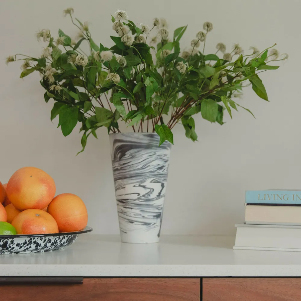 Geen Conic vaas is hetzelfde, omdat ze stuk voor stuk met de hand gegoten worden. Het marmereffect, dat ontstaat door verschillende kleuren te gebruiken, is uniek van vaas tot vaas. Ga voor een knallend kleuraccent in de meerkleurige versie of kies de voor de marmer-vibe van de zwart-witte versie.